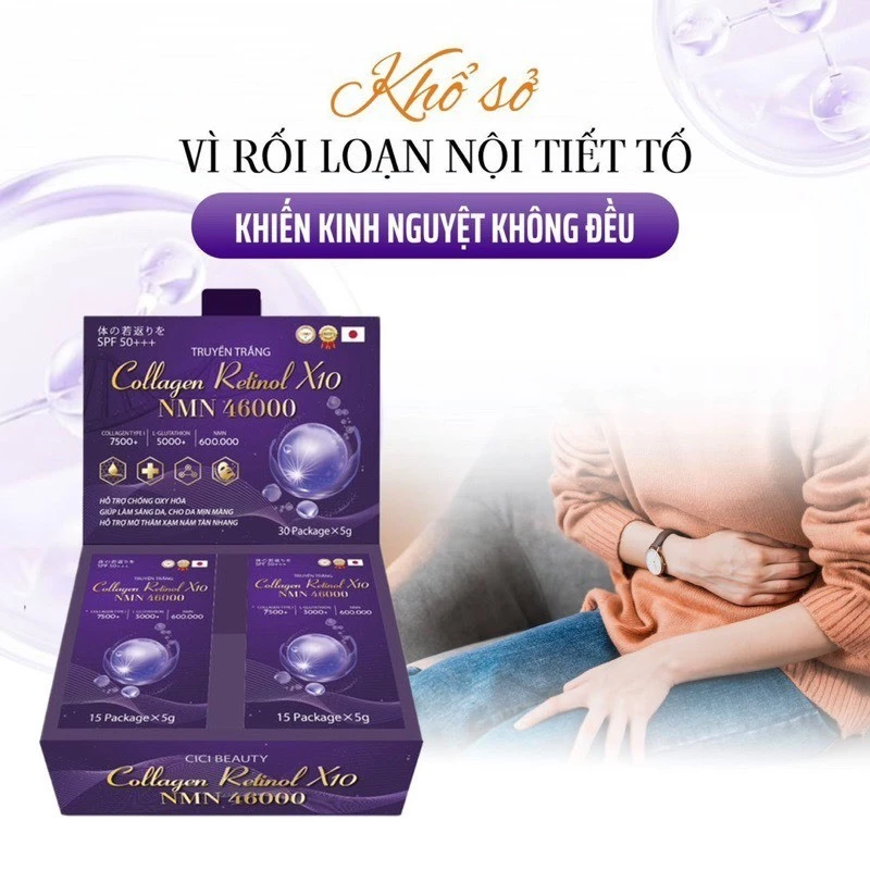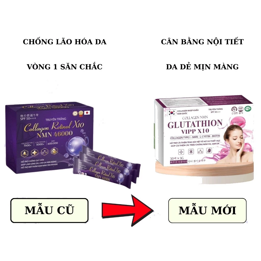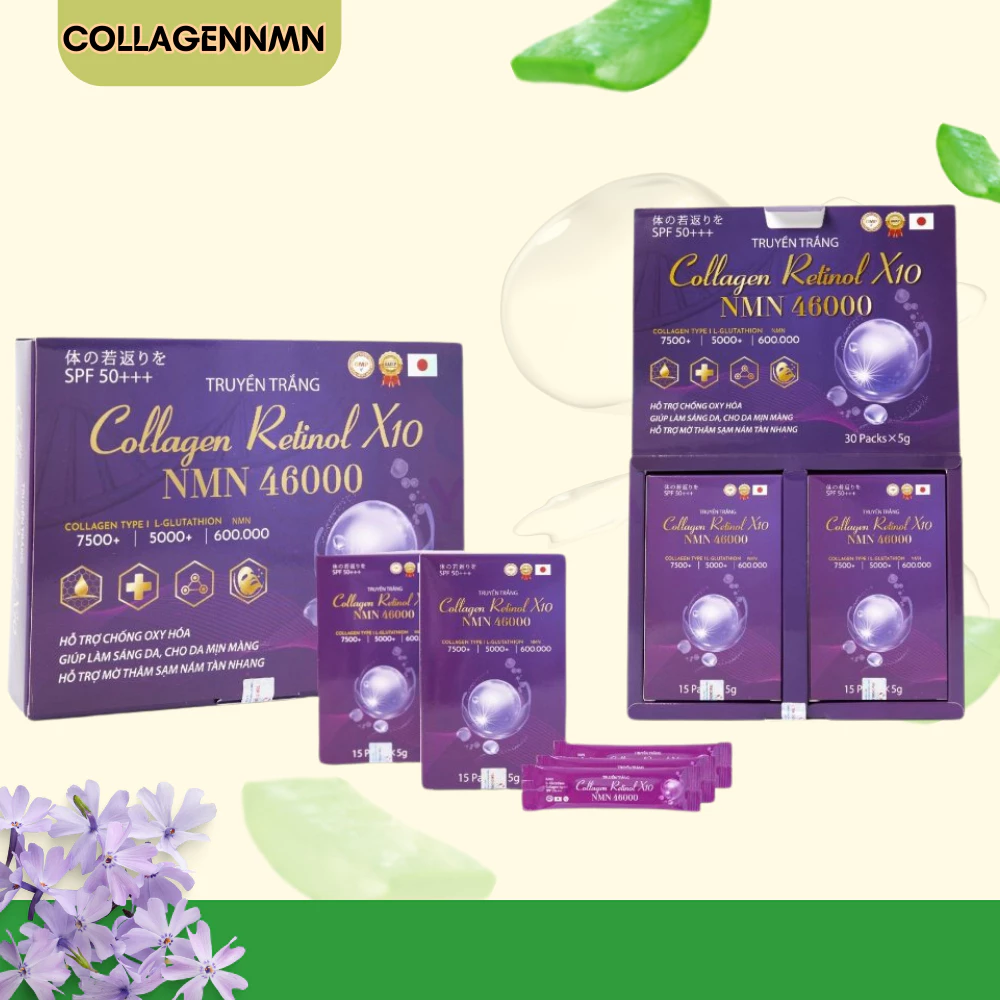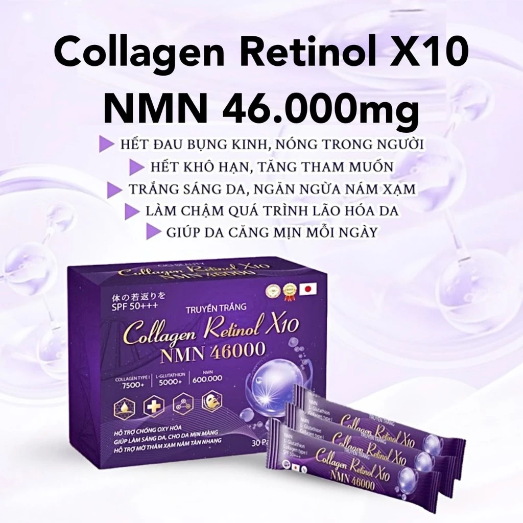 Colagen Retinol X10 NMN 46000 Hỗ Trợ Mờ Nám, Tàn Nhang, Giúp Da Sáng Mịn, Tăng Vòng 1 công dụng: ✅Duy trì độ ẩm ✅sáng màu da,mịn da ✅kích thích quá trình tái tạo làn da ✅tăng đàn hồi cho da ✅Huỷ nám và tàn nhang ✅chống lão hoá và giúp làm chậm quá trình lão hóa ?Đối tượng dùng: người bị nám và tàn nhang,da không đều màu ?cách dùng:uống 1gói/lần x 2lần / ngày có thể pha nước ấm hoặc nước lọc hoặc ăn trực tiếp ?dùng sau ăn 1 giờ ?lưu ý:sản phẩm không phải là thuốc không có tác dụng thay thế thuốc chữa bệnh
