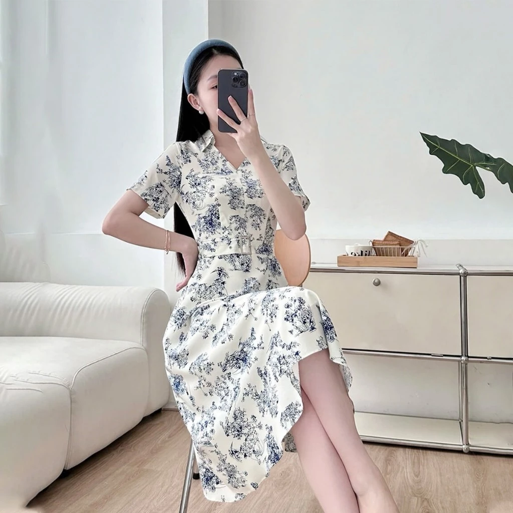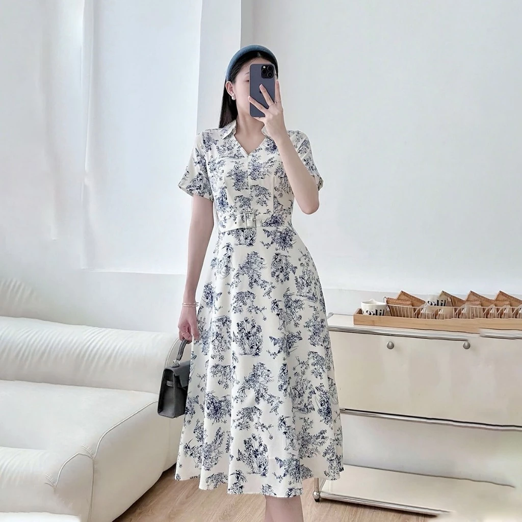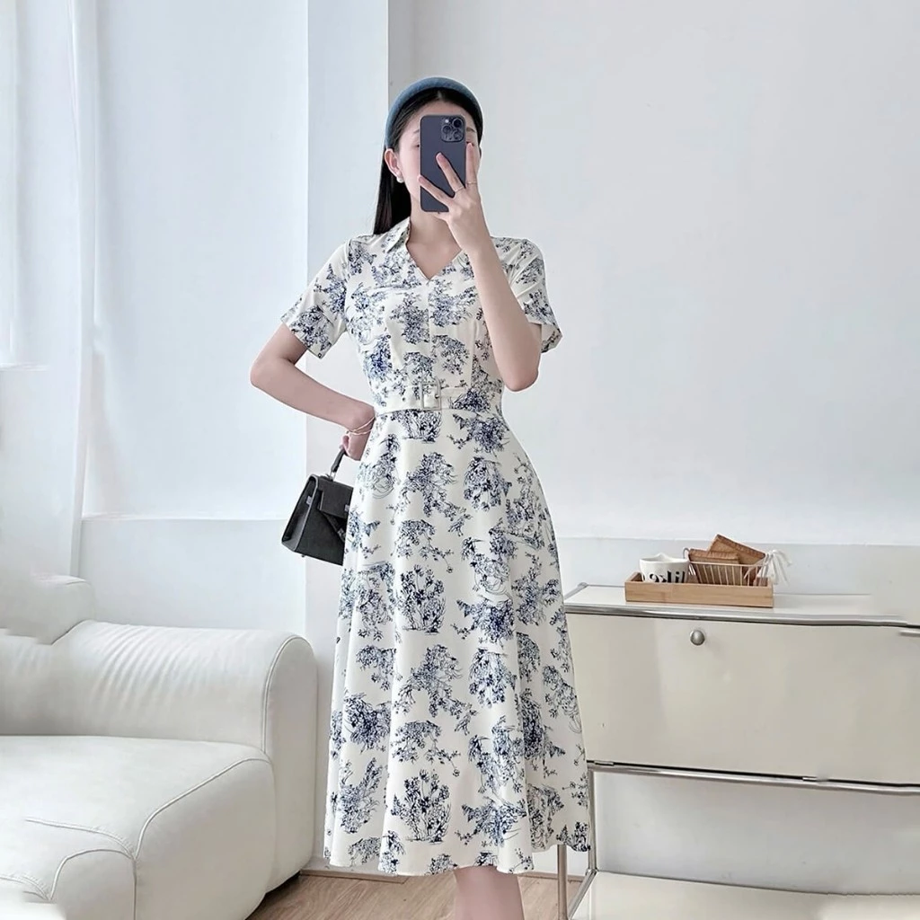 Đầm dáng A, cổ V lá cổ đứng. Tay ngắn dáng suông. Đầm có kèm 1 dây thắt lưng khóa bạc. Đầm không có túi, thân 1 lớp, tùng 2 lớp.