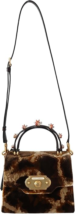Indulge in the epitome of Italian luxury with this exquisite Dolce & Gabbana Welcome Bag. Featuring an elegant brown giraffe pattern complemented by gold metal detailing, this handbag is a statement piece that radiates sophistication. The red leather interior adds a bold contrast while keeping your essentials organized with its zippered pocket and dual compartments. Whether carried by the adjustable and detachable leather strap or as a graceful clutch, this bag is sure to turn heads and elevate any ensemble. Material: 64% Viscose, 20% Leather, 16% Cotton Color: Brown Giraffe pattern Interior: Red leather lining Compartments: Two with inside pocket and zipper closure Closure: Push button flap Strap: Adjustable, detachable, 110cm length Dimensions: 19cm H x 25cm W x 12cm D Country of origin: Made in Italy Brand: Dolce & Gabbana Craftsmanship: High craftsmanship with exclusive detailing