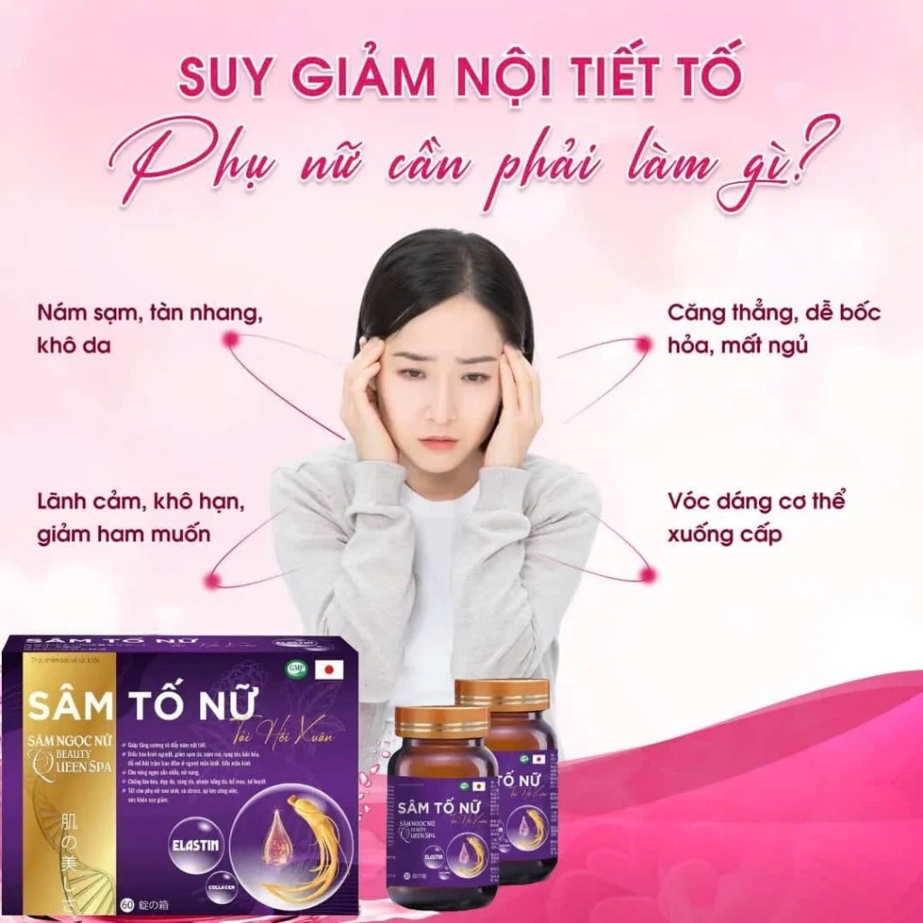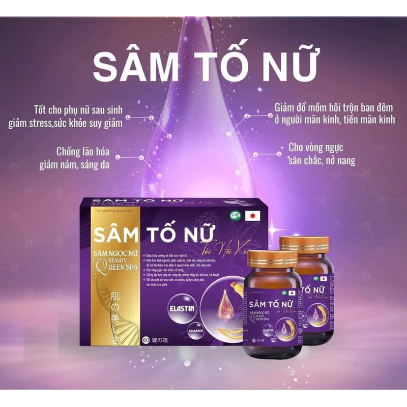 [Hộp 2 Lọ] Sâm Tố Nữ VIPP Tái Hồi Xuân Hổ Trợ Nội Tiết Tố Nữ, Cải Thiện Khô Hạn, Nám, Tàn Nhang NHÀ MÁY SẢN XUẤT THỰC PHẨM CHỨC NĂNG – CÔNG TY CỔ PHẦN DƯỢC PHẨM MEDIUSA Thành phần: Glutathione............................................ 200mg Cao Ích mẫu 100mg Cao Sâm tố nữ (Puerari mirifica extract) 50mg Cao Đương quy (Angelica spp) 50mg Cao Xuyên khung ( Ligusticum wallichii) 50mg Cao Bạch thược (Paeonia lactiflora) 50mg Collagen 50mg Tinh dầu hoa anh thảo 25mg L-Cystine 25mg Cao Hạt bí ngô..................................... 25mg Chiết xuất Củ mài (Pregnenonlone acetate) 20mg Cao Cúc la mã………….......................….…..10mg Sữa ong chúa 10mg Vitamin E (DL-alpha tocopheryl acetate) 10mg Chiết xuất Nhau thai cừu ................................. 5mg Phụ liệu: talc, tinh bột, calci carbonat, magie stearate, povidone K30 vừa đủ 1 viên Chỉ tiêu chất lượng chủ yếu tạo nên công dụng của sản phẩm: STT Tên chỉ tiêu Đơn vị tính Mức công bố 1 Glutathione mg/viên ≥ 180 2 Collagen mg/viên ≥ 40 3 Vitamin E mg/viên 10 ± 20% Sâm tố nữ Định tính Dương tính Thời hạn sử dụng sản phẩm: 3 năm kể từ ngày sản xuất.Ngày sản xuất và hạn sử dụng được in trên bao bì của sản phẩm Cách uống: sáng 1 viên - tối 1 viên uống trước và sau ăn 30 phút ?hổ trợ tăng cường nội tiết tố ,sáng da,đẹp da ?tăng vòng 1,nở nang ?cải thiện khô hạn ?cải thiện nám,tàn nhang,tóc rụng,tóc khô,bóc hoả,tiền mảng kinh và mảng kinh,giảm tress ,căng thẳng ?điều hoà kinh nguyệt ?Dùng được cho người từ 18 tuổi trở lên ?sản phẩm này không phải là thuốc không có tác dụng thay thế thuốc chữa bệnh