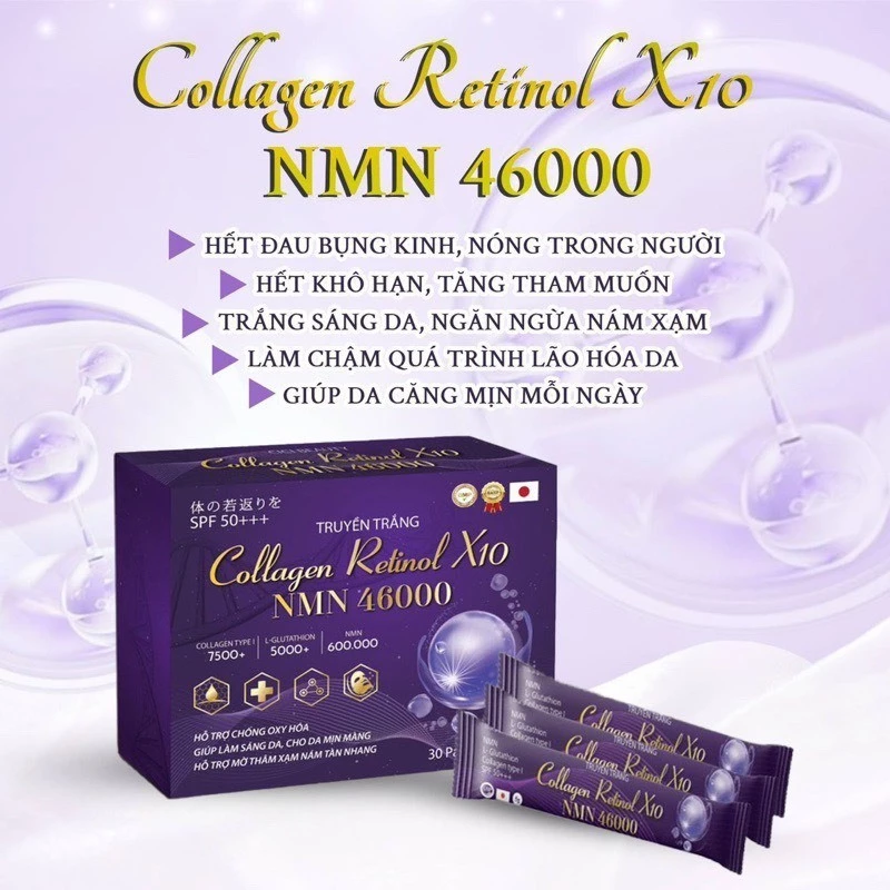 Colagen Retinol X10 NMN 46000 Hỗ Trợ Mờ Nám, Tàn Nhang, Giúp Da Sáng Mịn, Tăng Vòng 1 công dụng: ✅Duy trì độ ẩm ✅sáng màu da,mịn da ✅kích thích quá trình tái tạo làn da ✅tăng đàn hồi cho da ✅Huỷ nám và tàn nhang ✅chống lão hoá và giúp làm chậm quá trình lão hóa ?Đối tượng dùng: người bị nám và tàn nhang,da không đều màu ?cách dùng:uống 1gói/lần x 2lần / ngày có thể pha nước ấm hoặc nước lọc hoặc ăn trực tiếp ?dùng sau ăn 1 giờ ?lưu ý:sản phẩm không phải là thuốc không có tác dụng thay thế thuốc chữa bệnh