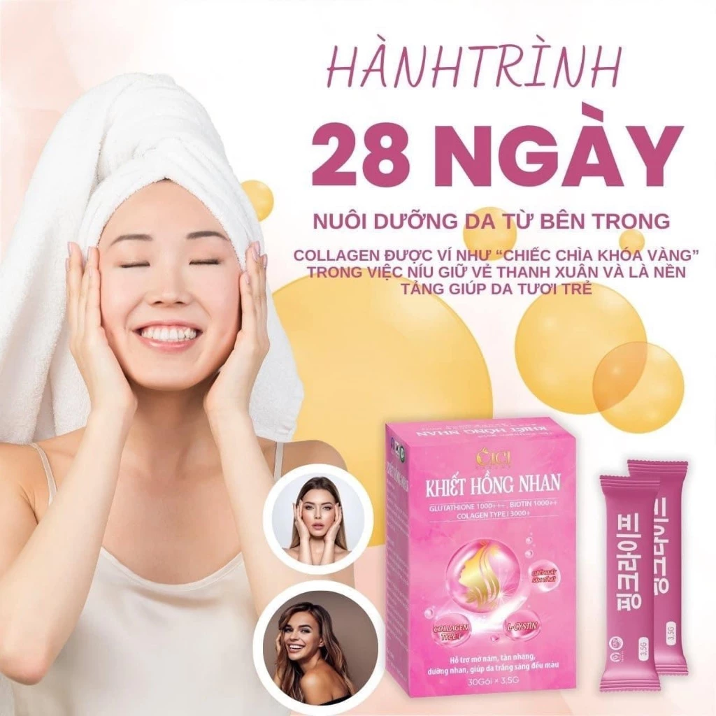 Collagen Truyền Trắng Khiết Hồng Nhan hỗ trợ mờ nám, sạm tàn nhang, dưỡng nhan, trắng da đều - Hộp 30 gói - YNOVA Khiết Hồng Nhan - Collagen truyền trắng hany Bột uống truyền trắng và bổ sung collagen cực hot nhà Hany đã về hàng. Trắng da - Căng bóng - Chống lão hoá So với các dòng truyền trắng khác em này khẳng định bảng thành phần cực Mlem giá siêu mềm rẻ nhất thị trường dòng uống căng bóng & làm trắng da. Cùng xem bảng thành phần xuất sắc nha -Glutathione: 1000mg -Collagen: 800mg - Vitamin C 220mg - 17 chủng lợi khuẩn có lợi cho da & cơ thể - Biotin 36UG Giúp ngăn ngừa rụng tóc, tóc bóng mượt, giảm gãy rụng - Acid Hyaluronic cấp nước cho da, căng bóng da mặt. - Hỗn hợp bột rau củ giàu chất xơ. Collagen + Glutthione + Vitamin C là công thức trắng da số 1 hiện nay. Cần chi đi tắm trắng ở Spa làm chi cho tốn kém, uống hộp truyền trắng này của nhà em trắng toàn thân, da dẻ mỡ màng này. Ngoài ra các chủng lợi khuẩn có lợi giúp da đẹp hơn, hạn chế, giảm mụn, bảo vệ cô bé khỏi viêm nhiễm. Biotin giúp giảm gãy rụng, giúp tóc ngày càng khoẻ, bóng mượt. Eo ui mua 1 mà được bao thứ tốt, giá mềm nữa chứ các c ơiiiiiiii, chả tội gì k rước về. ?Gói có vị chanh thơm ngon, dễ uống, sản phẩm thuộc thương hiệu Boto Hàn Quốc. - Xuất xứ Hàn Quốc ?Hướng dẫn sử dụng: Mỗi ngày 1 gói vào buổi sáng, uống trực tiếp bột hoặc pha với nước. - Lưu ý sản phẩm không phải là thuốc không thể thay thế thuốc chữa bệnh.