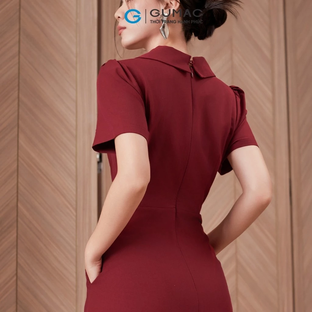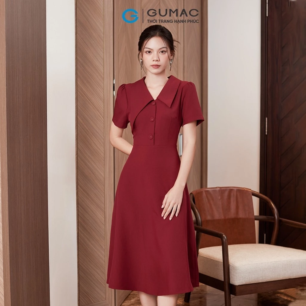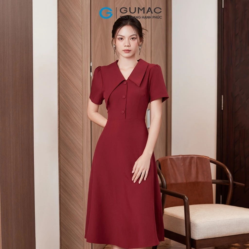 Đầm phom A xòe, tay ngắn. Lá cổ kiểu lệch. Nút bọc đính trang trí ở ngực. Dây kéo thân sau. Đầm may 1 lớp, hai túi sườn đầm.