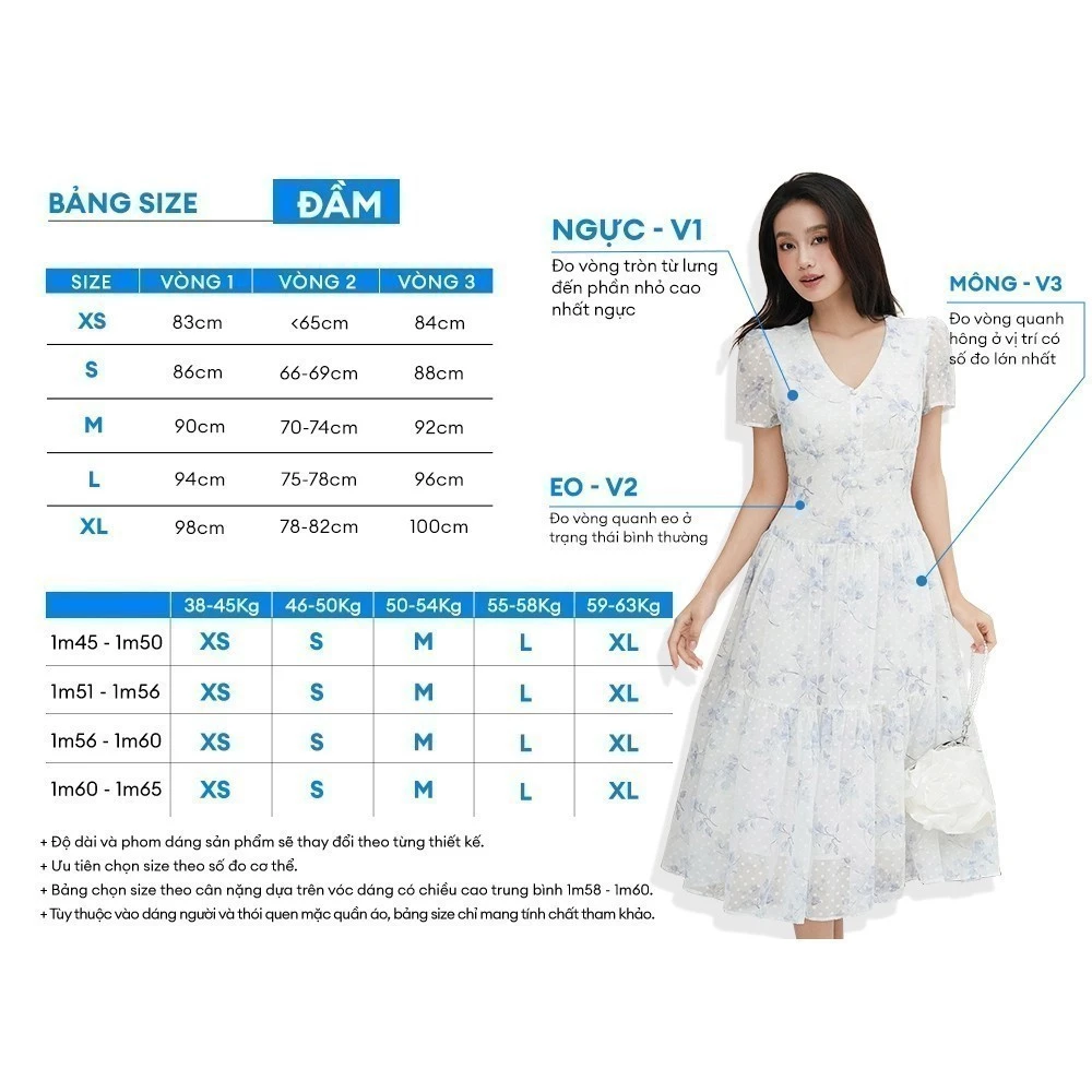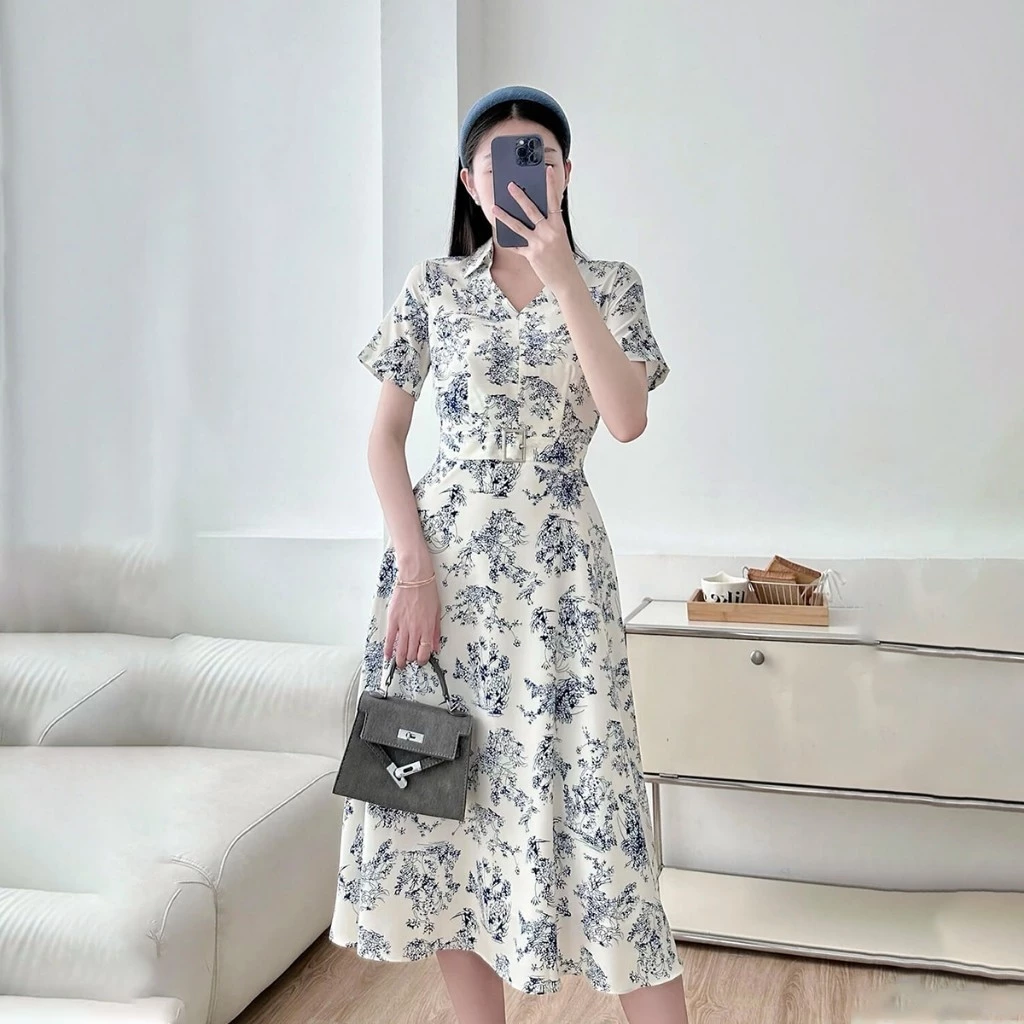 Đầm dáng A, cổ V lá cổ đứng. Tay ngắn dáng suông. Đầm có kèm 1 dây thắt lưng khóa bạc. Đầm không có túi, thân 1 lớp, tùng 2 lớp.