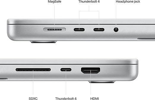 KẾT NỐI NHỮNG GÌ BẠN MUỐN — MacBook Pro có cổng sạc MagSafe, ba cổng Thunderbolt 4, khe cắm thẻ SDXC, cổng HDMI và giắc cắm tai nghe. Và tận hưởng kết nối không dây liền mạch với Wi-Fi 6E và Bluetooth 5.3.