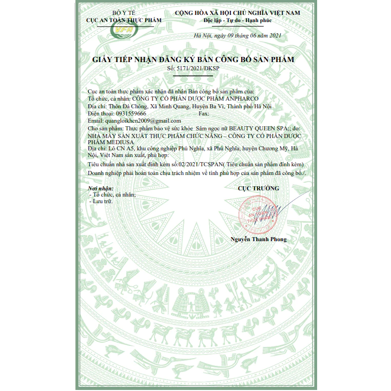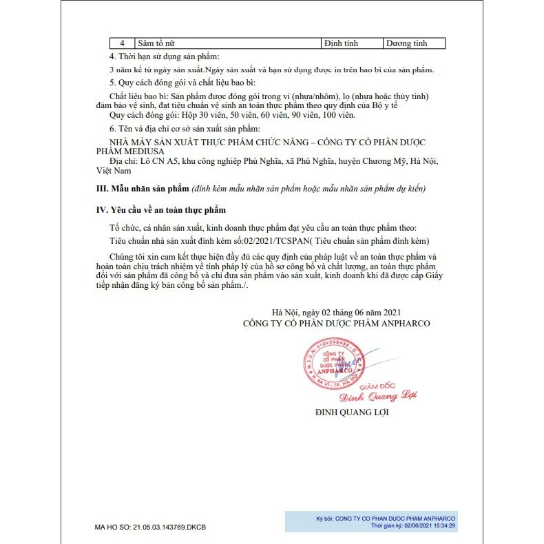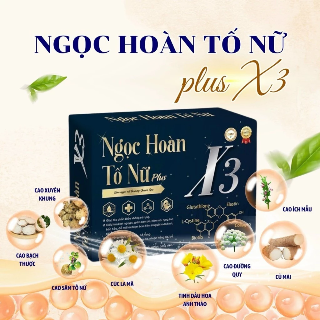 Sâm Tố Nữ NGỌC HOÀN Plus X3 Tái hồi xuân Phiên bản Cao Cấp hổ trợ nội tiết tố nữ (1 hộp 2 lọ tổng 60 viên) NHÀ MÁY SẢN XUẤT THỰC PHẨM CHỨC NĂNG – CÔNG TY CỔ PHẦN DƯỢC PHẨM MEDIUSA Địa chỉ: Lô CN A5, khu công nghiệp Phú Nghĩa, xã Phú Nghĩa, huyện Chương Mỹ, Hà Nội, Việt Nam Tên sản phẩm: Thực phẩm bảo vệ sức khỏe Sâm Tố Nữ NGỌC HOÀN Plus X3 Thành phần: Glutathione............................................ 200mg Cao Ích mẫu 100mg Cao Sâm tố nữ (Puerari mirifica extract) 50mg Cao Đương quy (Angelica spp) 50mg Cao Xuyên khung ( Ligusticum wallichii) 50mg Cao Bạch thược (Paeonia lactiflora) 50mg Collagen 50mg Tinh dầu hoa anh thảo 25mg L-Cystine 25mg Cao Hạt bí ngô..................................... 25mg Chiết xuất Củ mài (Pregnenonlone acetate) 20mg Cao Cúc la mã………….......................….…..10mg Sữa ong chúa 10mg Vitamin E (DL-alpha tocopheryl acetate) 10mg Chiết xuất Nhau thai cừu ................................. 5mg Phụ liệu: talc, tinh bột, calci carbonat, magie stearate, povidone K30 vừa đủ 1 viên Chỉ tiêu chất lượng chủ yếu tạo nên công dụng của sản phẩm: STT Tên chỉ tiêu Đơn vị tính Mức công bố 1 Glutathione mg/viên ≥ 180 2 Collagen mg/viên ≥ 40 3 Vitamin E mg/viên 10 ± 20% Sâm tố nữ Định tính Dương tính Thời hạn sử dụng sản phẩm: 3 năm kể từ ngày sản xuất.Ngày sản xuất và hạn sử dụng được in trên bao bì của sản phẩm Cách uống: sáng 1 viên - tối 1 viên uống trước và sau ăn 30 phút ?hổ trợ tăng cường nội tiết tố ,sáng da,đẹp da ?tăng vòng 1,nở nang ?cải thiện khô hạn ?cải thiện nám,tàn nhang,tóc rụng,tóc khô,bóc hoả,tiền mảng kinh và mảng kinh,giảm tress ,căng thẳng ?điều hoà kinh nguyệt ?Dùng được cho người từ 18 tuổi trở lên ?sản phẩm này không phải là thuốc không có tác dụng thay thế thuốc chữa bệnh