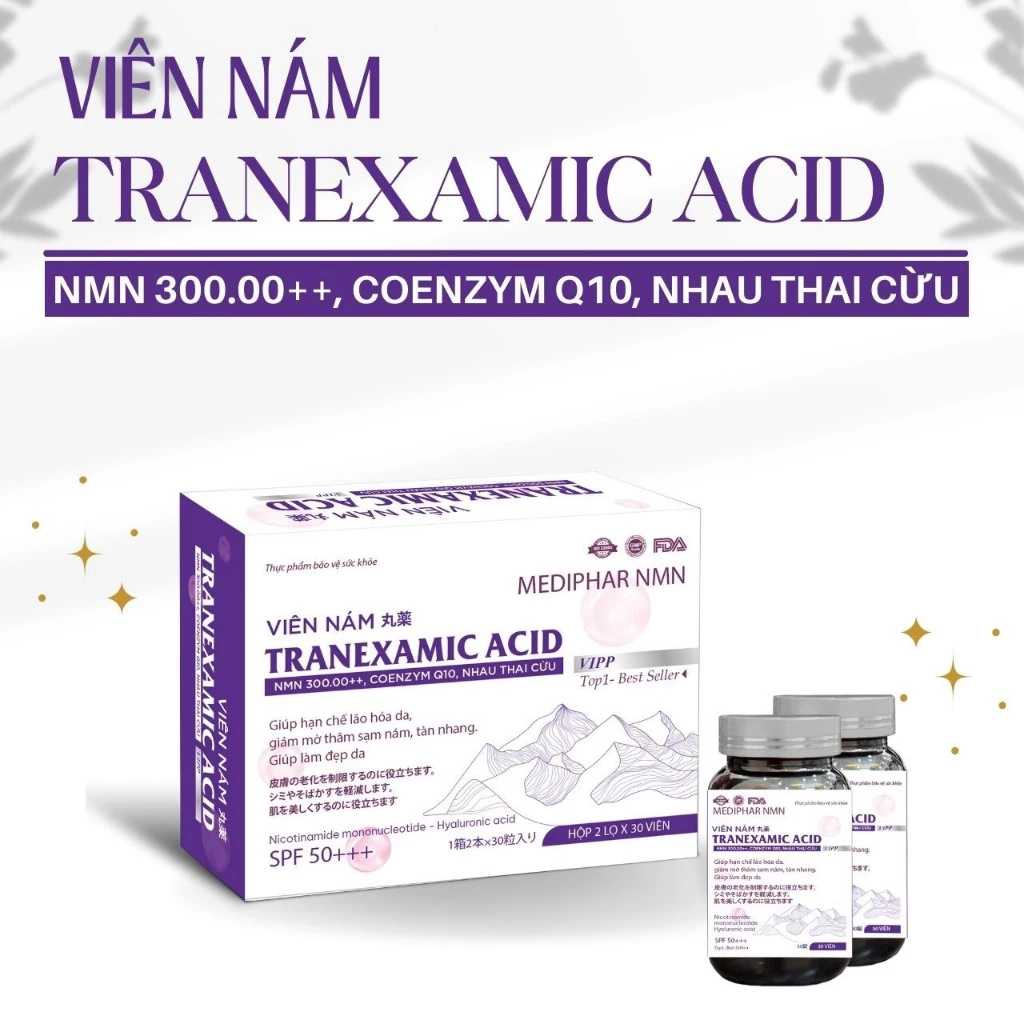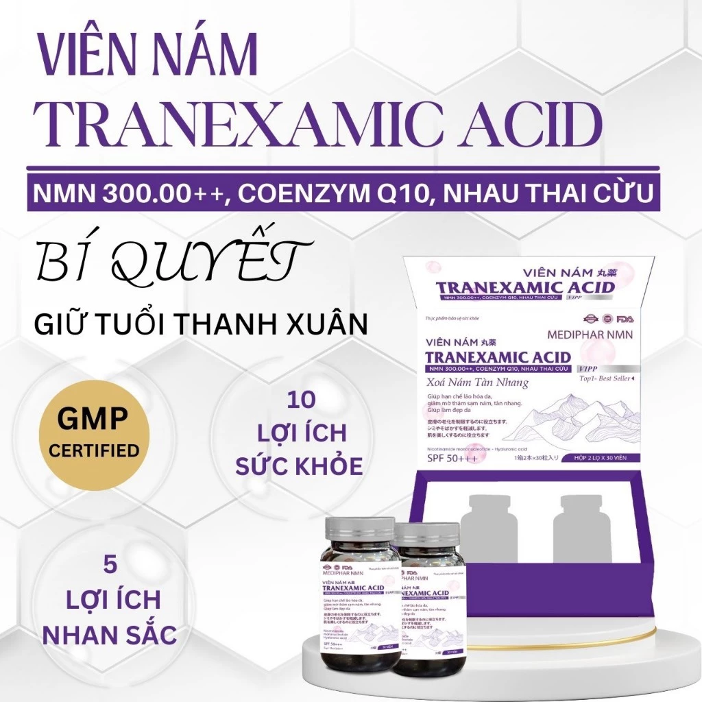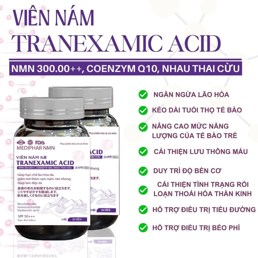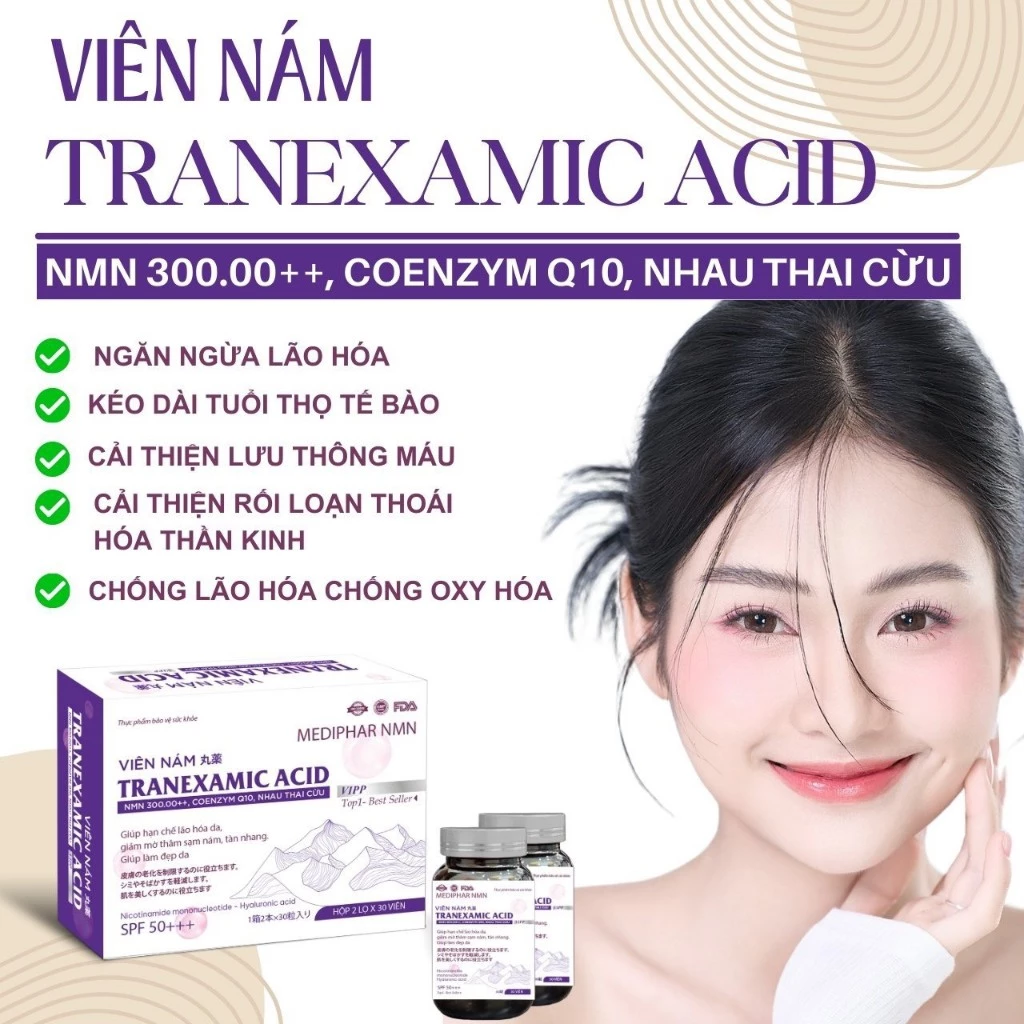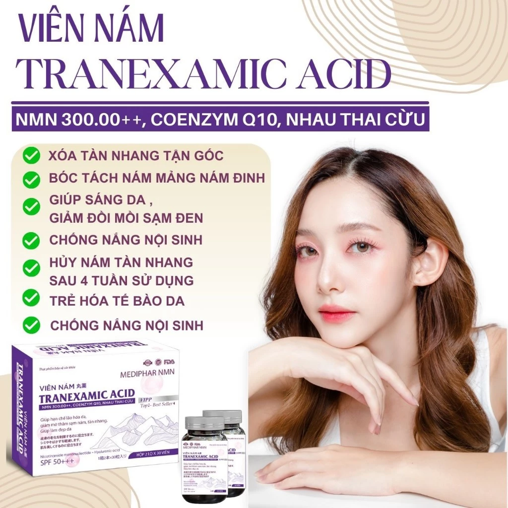 Viên Nám TRANEXAMIC ACID-Giải pháp xóa tận gốc các vết nám và tàn nhang, giúp da trắng sáng hộp 2 lọ CÔNG DỤNG: - Làm trắng da - Hỗ trợ mờ nám và tàn nhang - Da hồng hào, giảm quá trình lão hóa - Giảm tóc gẫy rung, mềm mượt - Làm chậm thời kỳ mãn kinh ĐỐI TƯỢNG SỬ DỤNG: - Người uống để trắng da - Người đang bị nám và tàn nhang - Người có nàn da đen, ngăm đen, da xỉn màu, da bị nhiễm sắc tố melanin, thâm đen, đốm nâu, đồi mồi. - Người bị nám da do tia cực tím UV, nám nội tiết sau sinh, tàn nhan, da khô sạm, nhăn nheo. - Người cần bổ sung dưỡng chất Collagen, khoáng chất và các chất chống lão hóa, chống gốc tự do. . CÁCH DÙNG: ~> Mỗi ngày 2 viên sáng và tối. uống sau ăn 30p ~>Lắc đều trước khi uống, ngon hơn khi ướp lạnh. LƯU Ý: - Dừng uống khi thấy dấu hiệu bất thường. - Mẫu bao bì thay đổi theo nhà sản xuất ✅Sản phẩm không phải là thuốc và không có tác dụng thay thế thuốc chữa bệnh.